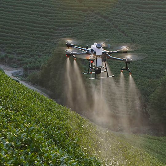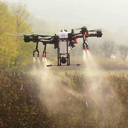 Наши дроны приспособлены для работы во фруктовых садах и для обработки труднодоступных мест в густых кронах деревьев при наклонном опрыскивании, обеспечивая равномерную адгезию жидких пестицидов и увеличивая количество капель.
